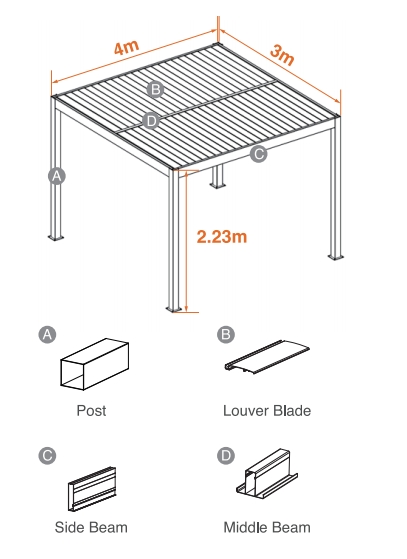 The Aluminium Pergola 100A-4 is designed for maximum comfort, durability, and ease of use. Its left and right louvers are independently controlled, allowing flexible shading without interference. The sleek, flat connections between posts and side beams create a modern, premium look. With a simple structure, installation can be completed in just 2 hours. Built to handle up to 50kg/sqm snow load, it delivers excellent strength at a highly cost-effective price.